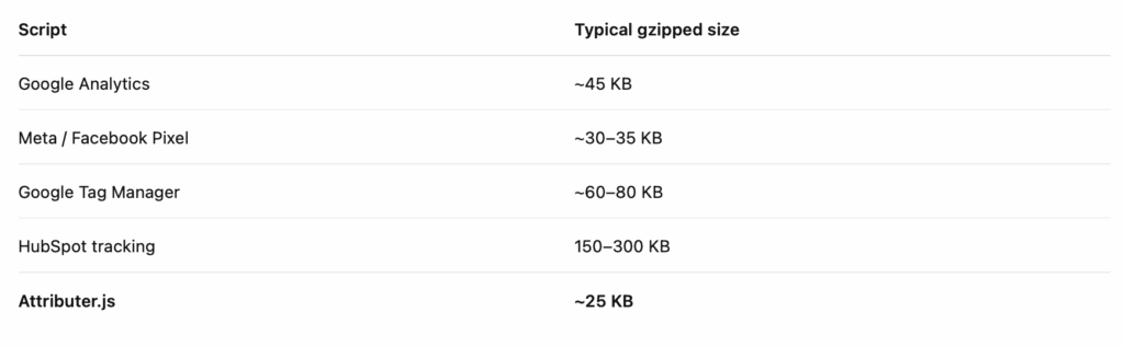 The Attributer Javascript code that you place on your website is small by modern web standards. The file itself is only 90kb uncompressed, which then gets compressed down to 25kb when it is served.